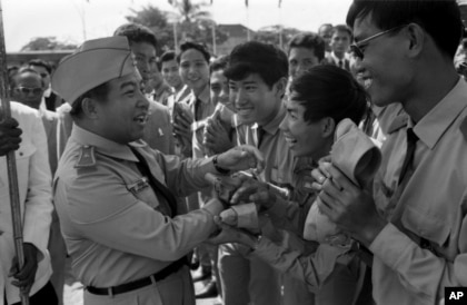 Prince Norodom Sihanouk, the Cambodian head of state, makes a speech at Orly National Airport located south of Paris, France on March 13, 1970. Sihanouk is returning to Phnom Pehn via Moscow and Peking. (Levy | AP)