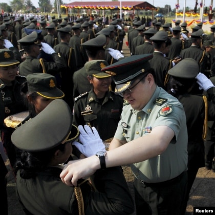 A Chinese army advisor awards rank insignia to Cambodian army graduates during a 2015 ceremony in Kampong Speu province. Military aid has strengthened China's ties with Cambodia, and analysts see it as part of Beijing’s push to extend its regional influence. (Samrang Pring | Reuters)