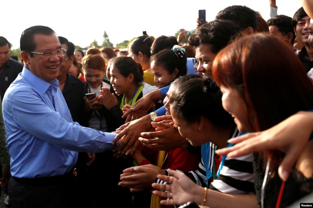In a typical speech, he said he would defend Cambodia from unspecified threats to peace and stability, and he claimed to have thwarted a revolution attempt by using “strong legal measures” to dissolve his main opposition challenger, the Cambodia National Rescue Party (CNRP), last year.