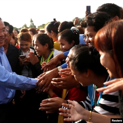 Garment workers, a powerful voting block long aligned with the opposition, greet Cambodia's Prime Minister Hun Sen at a provincial rally on May 30, 2018. (Samrang Pring | Reuters)