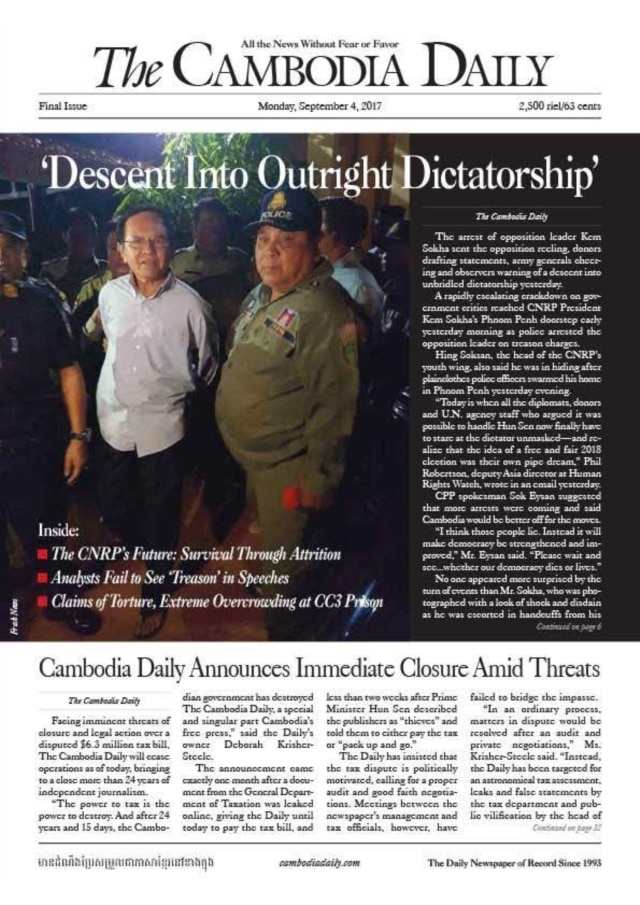 The Cambodia Daily bannered a pull-no-punches headline in its last edition. (Cambodia Daily)
