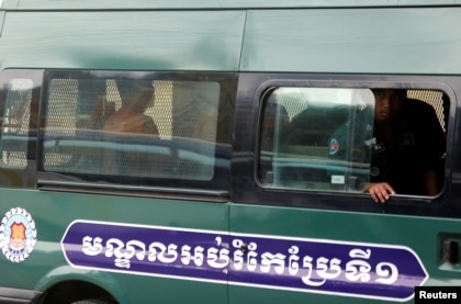 Uon Chhin and Yeang Sothearin, journalists formerly with Radio Free Asia (RFA), arrive in a police vehicle for a bail hearing at the Appeal Court in Phnom Penh on April 19, 2018. (Samrang Pring | Reuters)