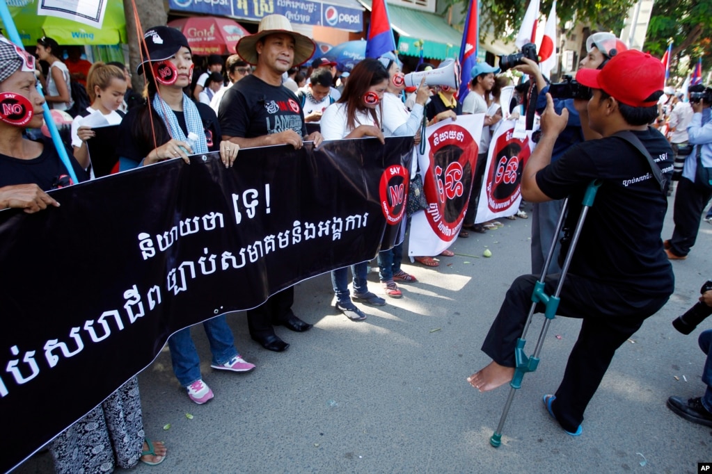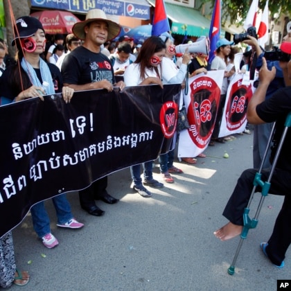 Demonstrators hold a banner that states: “Say No! Union, Association and NGO Laws” outside the Senate building in Phnom Penh, Cambodia, on July 24, 2015 to protest a draft law regulating non-governmental organizations and clamping down on civil society activities. (Heng Sinith | AP)