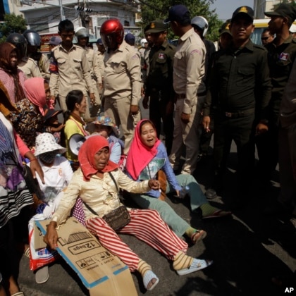 Farmers of Koh Kong province protesting land evictions are blocked by security during a protest rally as it moves near the Prime Minister's residence, in Phnom Penh, Cambodia, Tuesday, Feb. 14, 2017. Government security on Tuesday prevented the protesters from submitting a petition to Prime Minister Hun Sen at his residence to help solve their long-running land dispute with a local tycoon who owns sugarcane plantations they accuse of grabbing their land. (Heng Sinith | AP)
