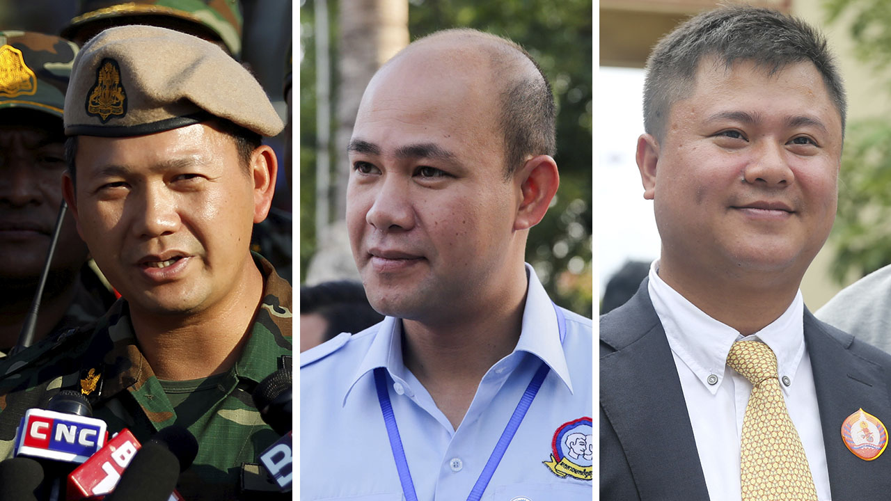 Hun Sen's children are seen as possible successors. Left: Hun Sen’s oldest son, Hun Manet, was recently promoted to deputy commander-in-chief of the Royal Cambodian Armed Forces. Middle: Hun Many is a CPP member of parliament. Right: Hun Manith is an army brigadier-general. Not pictured: Hun Mana, controls a major media company. (VOA News)