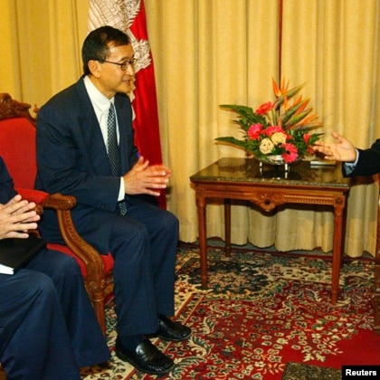 Cambodian opposition leader Sam Rainsy (C) and Son Chhay, a member of Sam Rainsy's party, talk to the President of the National Assembly Prince Norodom Ranariddh (R) at the assembly building in Phnom Penh February 15, 2006. (Chor Sokunthea | Reuters)