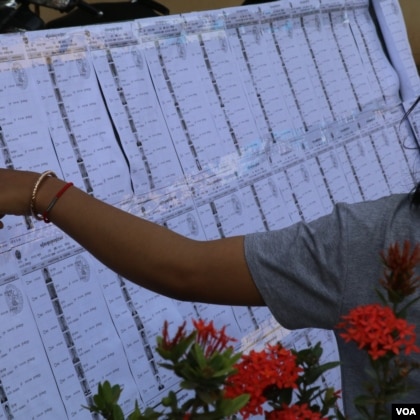 ប្រជាពលរដ្ឋនៅក្នុងឃុំអរិយក្សត្រផ្ទៀងផ្ទាត់ឈ្មោះនៅក្នុងការិយាល័យមួយ មុនចូលទៅបោះឆ្នោត។ (ស៊ុន ណារិន | VOA Khmer)