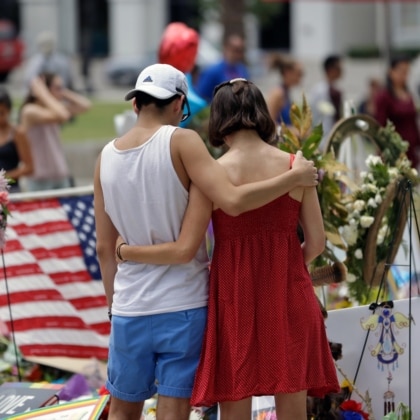 A couple observe a makeshift memorial honoring the victims of the Pulse nightclub mass shooting, June 20, 2016, in Orlando, Fla. (AP)