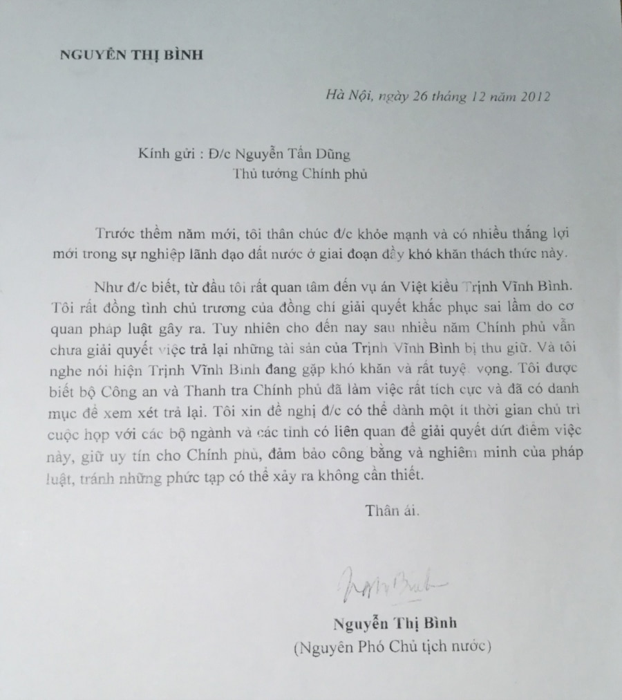Ngày 26/12/2012, nguyên Chủ tịch nước Nguyễn Thị Bình gửi thư cho Thủ tướng Nguyễn Tấn Dũng và “đề nghị đ/c [đồng chí] có thể dành ra một ít thời gian chủ trì cuộc họp với các bộ ngành và các tỉnh có liên quan để giải quyết dứt điểm việc này, giữ uy tín cho Chính phủ, đảm bảo công bằng và nghiêm minh của pháp luật, tránh những phức tạp có thể xảy ra không cần thiết.”