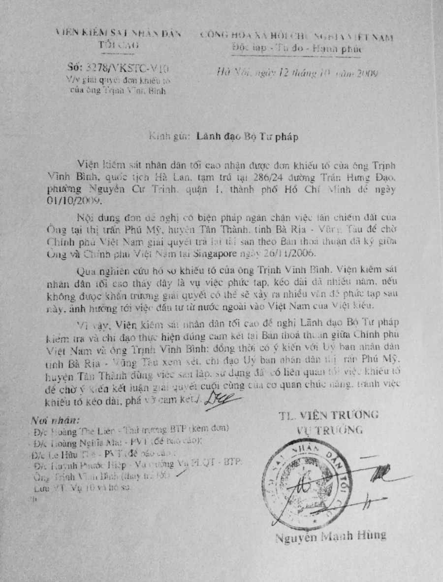 Trước đó, một văn bản từ Viện Kiểm sát Nhân dân Tối cao ngày 12/10/2009 gửi Lãnh đạo Bộ Tư pháp cũng đề nghị Bộ này “có ý kiến” với UBND tỉnh Bà Rịa-Vũng Tàu, “chỉ đạo Ủy ban nhân dân thị trấn Phú Mỹ, huyện Tân Thành dừng việc san lấp, sử dụng đất có liên quan tới việc khiếu tố để chờ ý kiến kết luận giải quyết cuối cùng của cơ quan chức năng, tránh việc khiếu tố kéo dài, phá vỡ cam kết.”