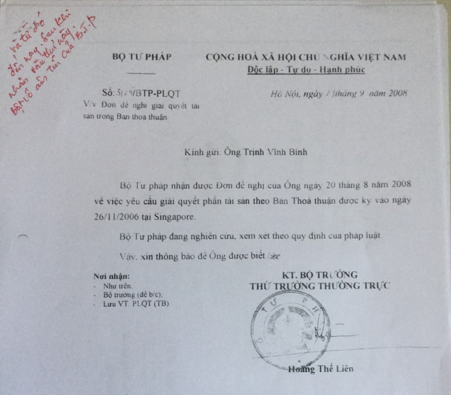 Phía Việt Nam thời gian đầu khi nhận được đơn yêu cầu trả lại tài sản của ông Bình cũng có văn thư trả lời cho ông. Một văn bản Bộ Tư pháp Việt Nam gửi cho ông Trịnh Vĩnh Bình vào tháng 9/2008 nói Bộ này “đang nghiên cứu, xem xét theo quy định của pháp luật.” Nhưng theo lời ông Bình, kể từ sau văn thư này, Bộ Tư pháp “bặt vô âm tín.”