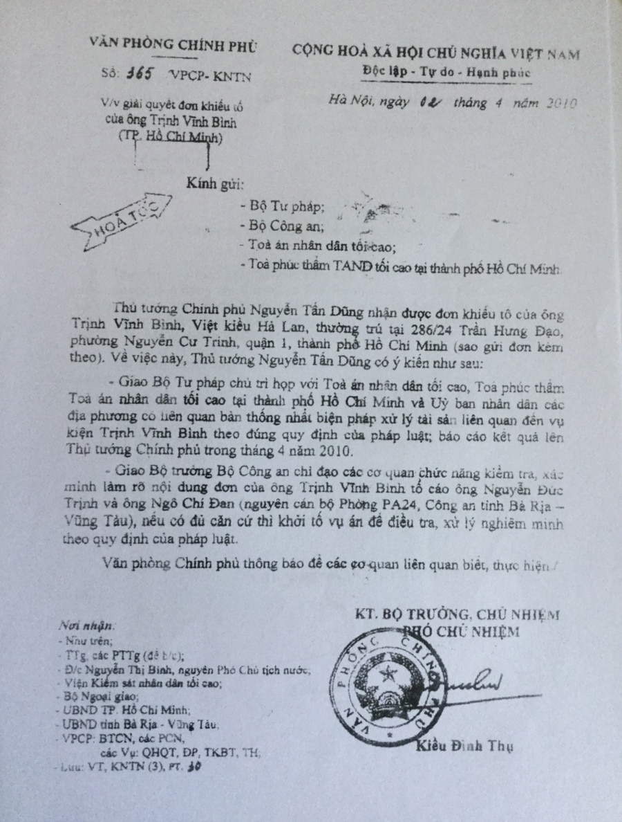 Một văn bản đóng dấu “Hỏa tốc” của Văn phòng chính phủ gửi cho Bộ Tư pháp, Bộ Công an, Tòa án Nhân dân Tối cao và Tòa phúc thẩm TANDTC tại TP.HCM vào ngày 2/4/2010 ghi rõ: “Giao Bộ Tư pháp chủ trì họp với Tòa án Nhân dân Tối cao, Tòa phúc thẩm Tòa án Nhân dân Tối cao tại thành phố Hồ Chí Minh và Ủy ban Nhân dân các địa phương có liên quan bàn thống nhất biện pháp xử lý tài sản liên quan đến vụ kiện Trịnh Vĩnh Bình theo đúng quy định của pháp luật; báo cáo kết quả lên Thủ tướng Chính phủ trong tháng 4 năm 2010.”